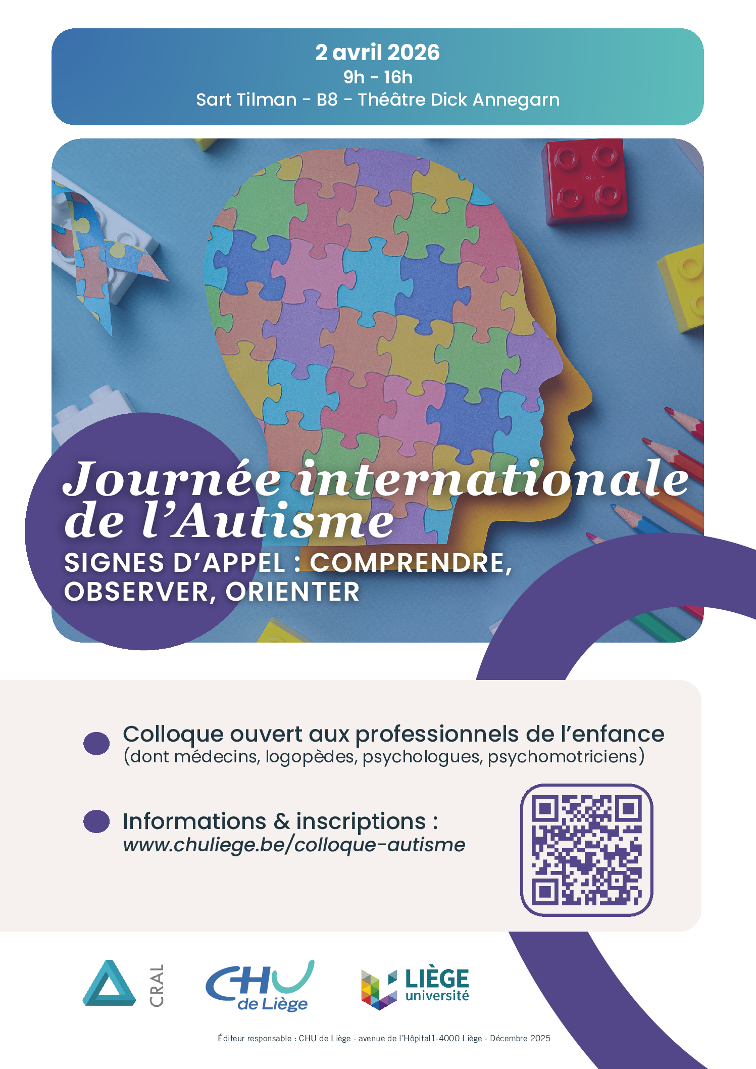 À l’occasion de la Journée internationale de l’Autisme, le CRAL du CHU de Liège organise un colloque médical consacré au repérage précoce des troubles du spectre de l’autisme (TSA). Cette journée de formation s’adresse aux professionnels de la santé concernés par le développement de l’enfant et l’accompagnement des familles.